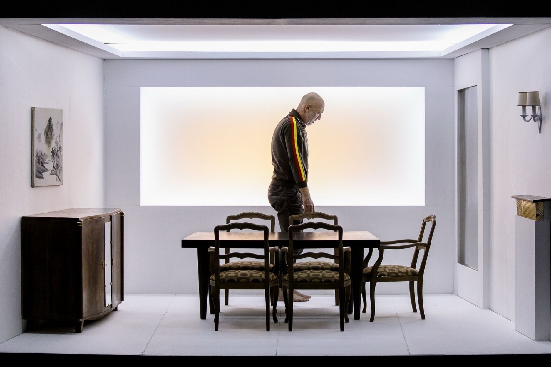 Il est seul, dans un espace trop petit pour lui, et chacun de ses mouvements résonne de façon extraordinaire, comme si chaque déplacement, aussi petit soit-il, était lesté d’une tension énorme. Autour de lui, l’espace convivial d’une salle à manger semble écrasé par sa présence et prêt à voler en éclats. Entre cet espace et le public, un tronc d’arbre repose sur le sol et sert de projection à un poème d’Agrippa d’Aubigné. Frappé par le danseur, le tronc d’arbre se révèlera être un tambour de bois. Peut-être s’agit-il de trouver une musicalité physique au poème, une sorte de contrepoint polyphonique − corps, voix, bruitages – à ces alexandrins chargés d’horreur et de révolte. Peut-être s’agit-il aussi de trouver un espace, comme ces “miniatures” de l’époque médiévale peintes sur un bout de bois qui libèrent le subconscient de ses traumatismes et l’aident à transformer sa plainte.